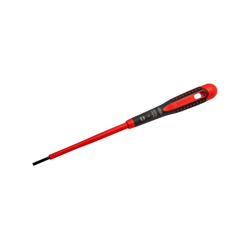 • Screwdriver developed according to the scientific ERGO™ process • ERGO™ insulated VDE screwdriver for slotted head screws • For work on live equipment, up to 1000 V, high quality blade insulation moulded directly onto the blade • Black oxide tip for higher accuracy • Three-component handle for maximum user comfort, soft material with ridged surface provides superior grip and greater force transmission • Maximum comfort with minimum effort due to the ergonomic design • Easy to choose the right tip with the colour-coded handle and permanent symbol on the domed end • No colour identification in extra small handle, sizes 2.5, 3.0, 3.5 • Flat face to prevent it from rolling away • Integrated hanging hole • Size 10 and 12, in double shape handle for use with both hands for maximum torque power • High-performance alloy steel blade • Individually inspected and manufactured according to IEC 60900, tested in a water bath at 10000 V • Standards: ISO 2380/DIN 5264