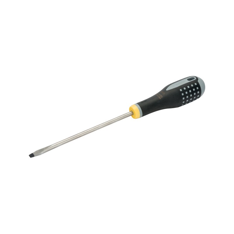 • Screwdriver developed according to the scientific ERGO™ process • For slotted head screws • Black oxide tip for higher accuracy • Three-component handle for maximum user comfort, soft material with ridged surface provides superior grip and greater force transmission • Maximum comfort with minimum effort thanks to an ergonomic design • Easy to choose the right tip with the colour-coded handle and permanent symbol on the domed end • Flat face to prevent rolling away • Integrated hanging hole • Size 10 mm, in double shape handle for use with both hands for maximum torque power • High-performance alloy steel blade with chrome plating, entirely hardened for high protection against corrosion, long life tool • Standards: ISO 2380 and DIN 5264