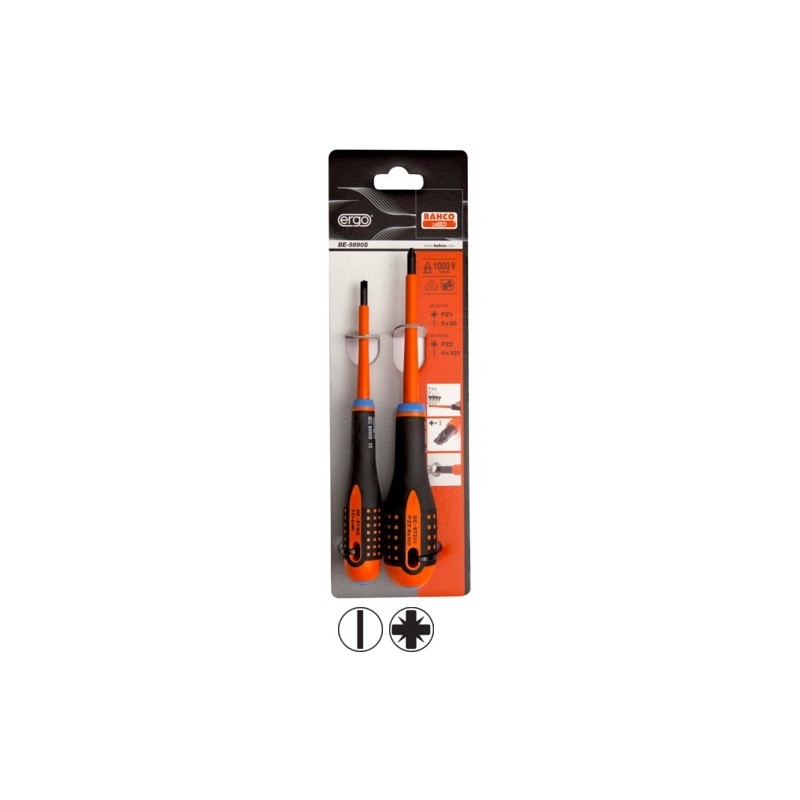 • Includes 2 pieces of insulated VDE ERGO™ screwdrivers • For work on live equipment, up to 1000 V, high quality blade insulation moulded directly onto the blade • Plus-minus 5.0/PZ1 x 80 and 6.0/PZ2 x 100 for terminal screws • Screwdriver developed according to the scientific ERGO™ process • For use in electric racks and terminal blocks • Black oxide tip for higher accuracy • Three-component handle for maximum user comfort, soft material with ridged surface provides superior grip and greater force transmission • Maximum comfort with minimum effort due to the ergonomic design • Easy to choose the right tip with the colour-coded handle and permanent symbol on the domed end • Flat face to prevent it from rolling away • Integrated hanging hole • High-performance alloy steel blade • Individually inspected and manufactured according to IEC 60900, tested in a water bath at 10000 V • In cardboard box