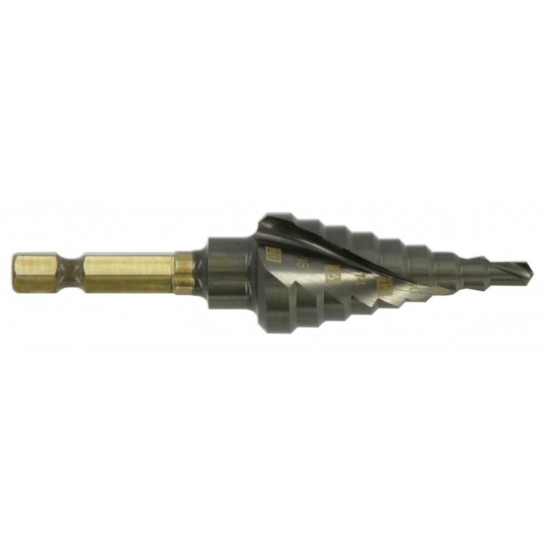 •Impact Tool Compatibility: Features a robust design and shank optimized for safe and efficient use with impact drivers and impact drills. •HSS (High-Speed Steel) Construction: Provides excellent strength and wear resistance for demanding professional use. •TiAlN (Titanium Aluminum Nitride) Coating: A premium coating that significantly increases surface hardness and thermal stability, allowing for higher cutting speeds and extended tool life. •Helicoidal Flutes (Spiral Flutes): Designed for superior chip evacuation, reduced friction, and optimal comfort and control during drilling. •Split-Point Tip: Enables automatic self-centring (or "auto-centring"), allowing for direct start without the need for a pre-drilled pilot hole, even on smooth surfaces. •Hexa (Hexagonal) Shank: Provides a secure grip in the chuck, preventing slippage, especially under high torque, and is perfect for quick-change impact chucks. •Conical/Stepped Design: Allows you to drill multiple, perfectly calibrated hole diameters (4 mm to 20 mm) with a single bit, saving time and tool changes.