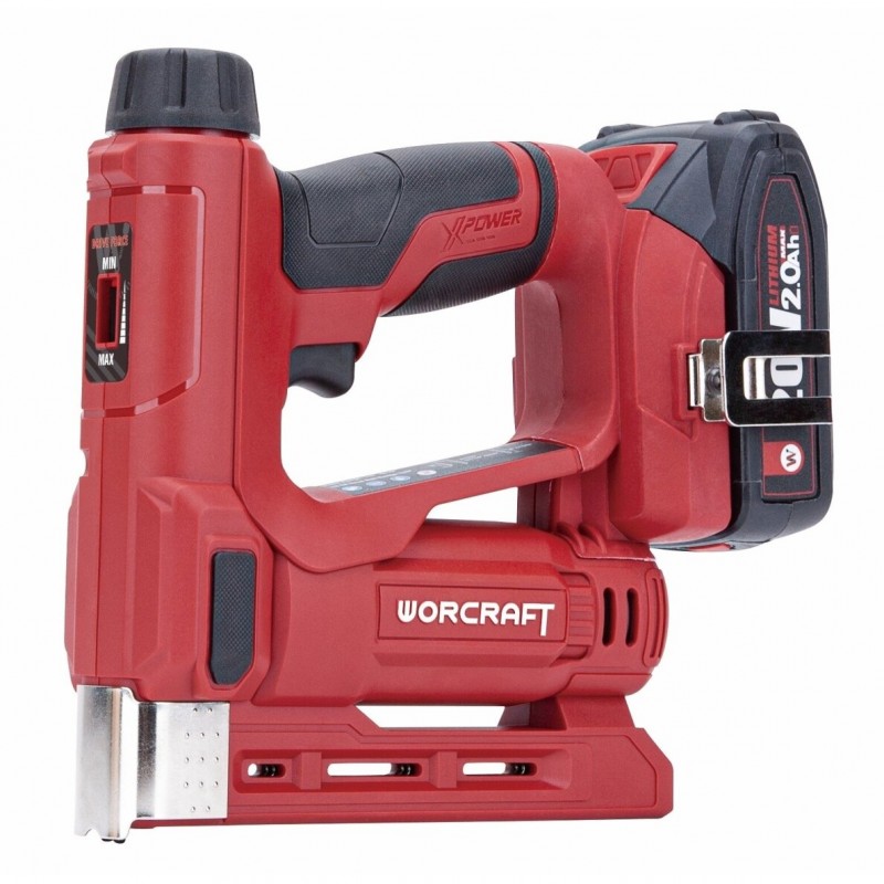 Akumuliatorinis kombinuotas vinių kalimo įrankis „WORCRAFT CNS-S20LiCM“ skirtas greitam ir patikimam medienos, faneros, medžio drožlių plokščių ir kitų medžiagų tvirtinimui vinimis arba kabėmis