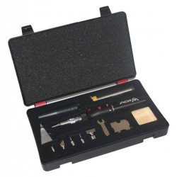 Device designed for soldering, burning wood, melting, shrinking, hot cutting, and also for paint removal. This device combines a wide range of applications in a single device, through the use of seven interchangeable tips. Ignition type: Piezo The capacity of the gas tank: 12ml. / 6 grams, Operating time (depending on the flame): 45 - 90 min., Warm-up time after switching: ± 5 s, The welding temp.1300 ° C,Temp. for soldering: 500 ° C Temp. of the knife for cutting: 260 ° C, Height: 187mm, Thickness: 39mm, Shank diameter: 25mm, Gross Weight: 108g