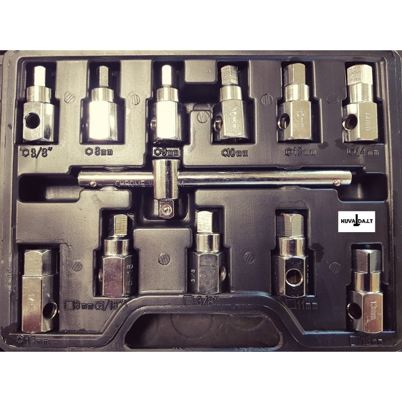 3/8”, 8, 9, 10, 12, 14, 17mm Šešiakampiai antgaliai 3/8”, 8, 11, 13 mm Keturkampiai antgaliai Sukimo rankena 3/8