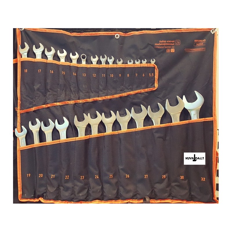 26 vienetai kombinuotų raktų: 5.5, 6, 7, 8, 9, 10, 11, 12, 13, 14, 15, 16, 17, 18, 19, 20, 21, 22, 23, 24, 25, 26, 27, 28, 30, 32 мм. Serija: AvtoDelo Professional Medžiaginiame dėkle.